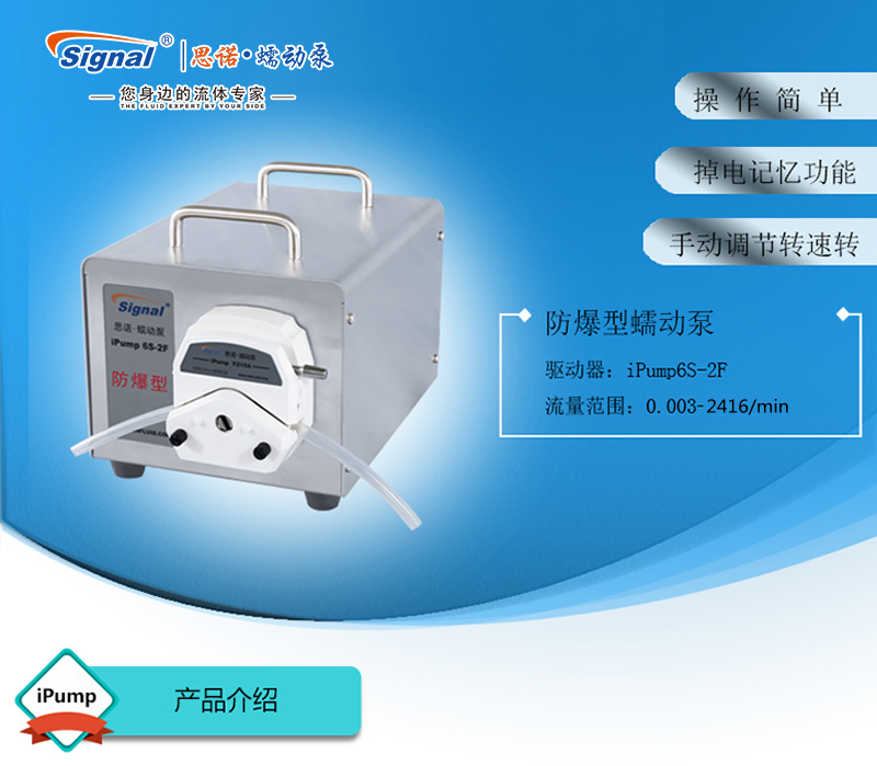 1.流量范圍:3-2416ml/min 2.免維護交流防爆減速電機驅動,變頻器調節轉速 3.電機扭矩大,可級聯雙泵頭 4.防爆等級DIIBT4,適合易燃易爆環境使用 5.304不銹鋼外殼,易擦拭,耐腐蝕,便于攜帶