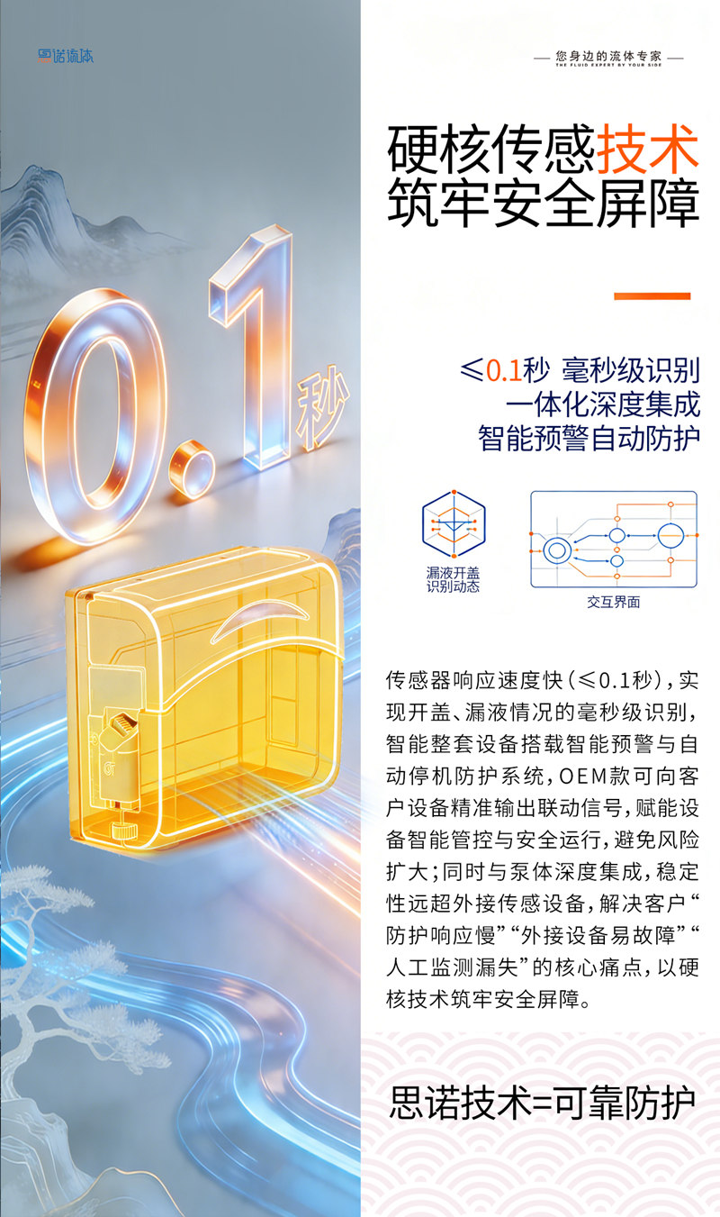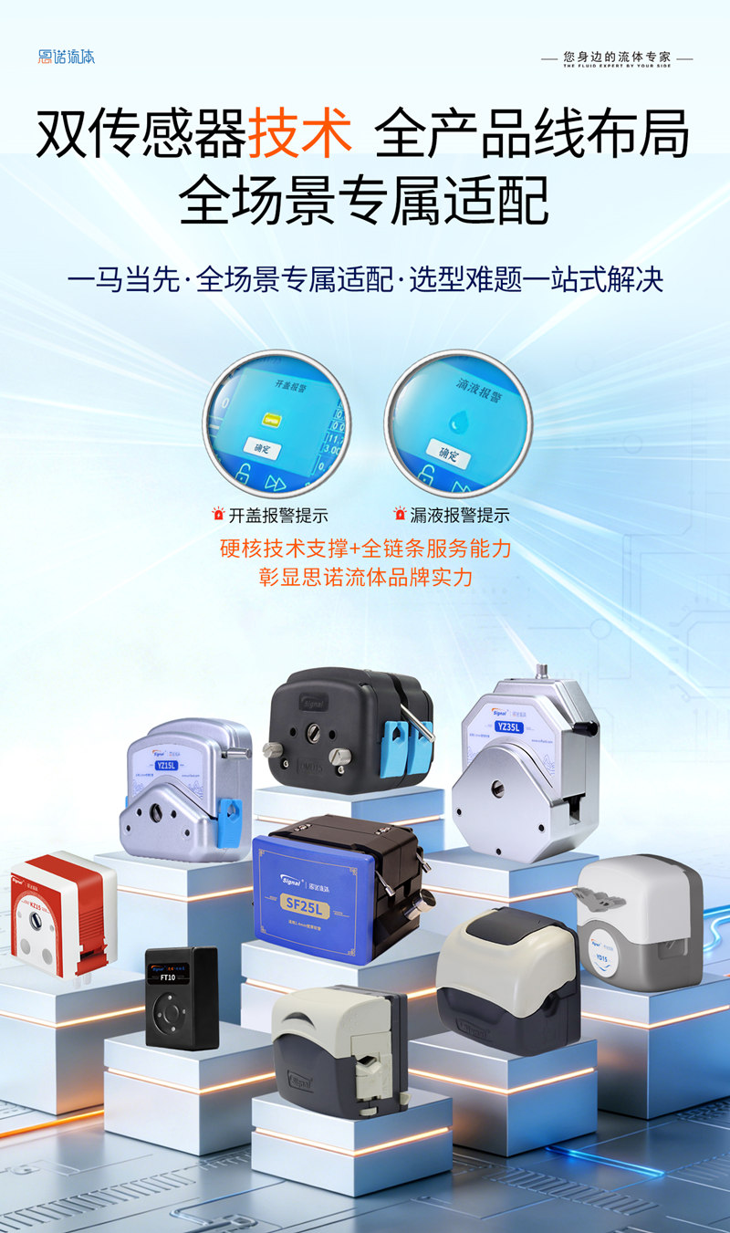 思諾流體錨定 “雙重當先” 戰略,以開蓋 + 漏液雙傳感技術定義蠕動泵智能防護新標準!行業內一馬當先研發應用,全產品線系列化覆蓋,≤0.1 秒毫秒級響應 + 智能預警筑牢防護壁壘,無縫適配生物、制藥、環保、食品、化工新能源等全場景,源頭規避安全事故與物料損耗,實現安全 + 成本 + 效率三重賦能,以技術標桿守護全場景生產安全!