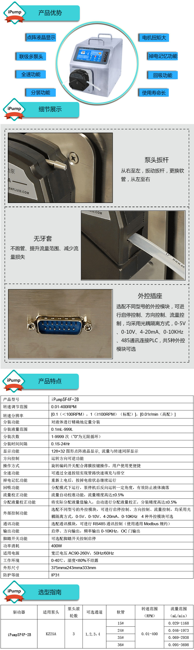 1.流量范圍:0.029-3698mL/min 2.兩種工作模式,流量模式與分配模式可選 3.具有流量校正、分裝液量校正功能 4.分裝精度高達±0.4%以內 5.采用伺服電機驅動,控制準,動力強勁 6.線路板全部三防漆處理,防腐、防潮