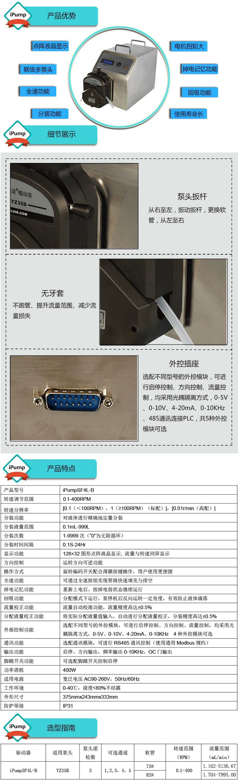 1.流量范圍:1.162-7995mL/min 2.兩種工作模式,流量模式與分配模式可選 3.具有流量校正、分裝液量校正功能 4.分裝精度高達±0.4%以內 5.采用伺服電機驅動,控制準,動力強勁 6.線路板全部三防漆處理,防腐、防潮